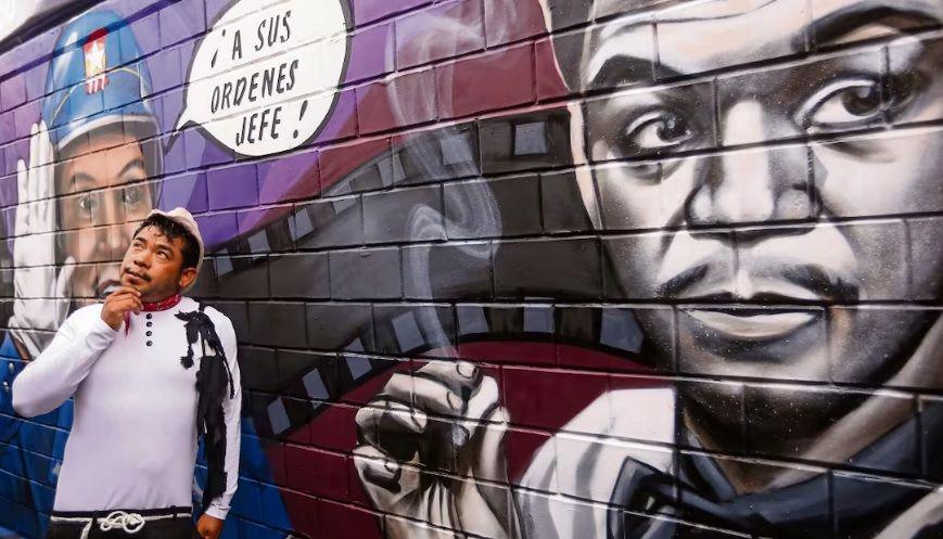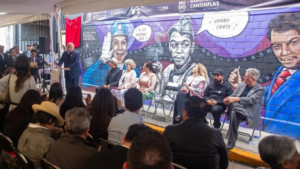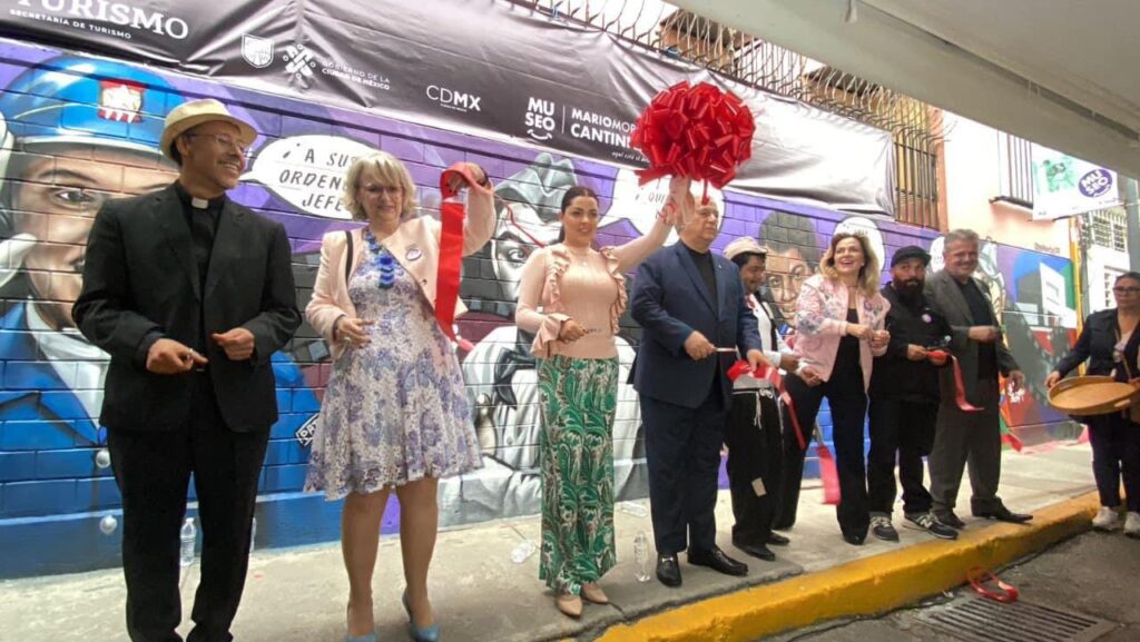 Develación de mural elaborado por el artista Yuka, en el marco del aniversario de Natalicio del actor Mario Moreno “Cantinflas” en el lugar donde vivió y creció, en el anterior barrio de Santa María la Redonda, Ahora Eje Central 182 col Guerrero alcaldía Cuauhtémoc.